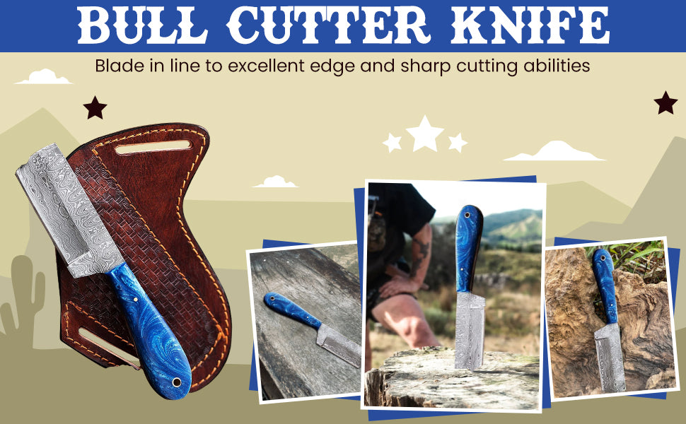 HAND FORGED DAMASCUS STEEL CONSTRATION BULL CUTTER COWBOY KNIFE & RISEN HANDLE