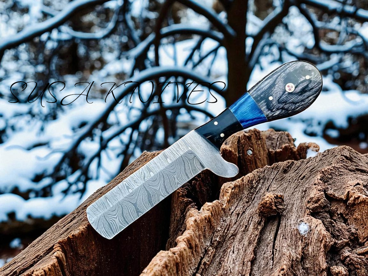Do you want to elevate your outdoor enthusiast's adventure? Then no need to worry you're at the right place where you can get outdoor survival tools. Our hunting knives for men are more than a tool, it's a symbol of tradition, strength, & and reliability. SUSA KNIVES cowboy knife is ideal for Skinning, survival, hunting, camping, and many more. ★ SUSA Knives- Handmade Damascus Steel Bull Cutter Knife, Cowboy Fixed Blade Knife, Ergonomic Wooden Handle with Cross Draw Leather Sheath. ✔ Overall length: 8"Inches ✔ Blade length: 4"Inches ✔ Handle length: 4"Inches ✔ Blade material: Damascus steel (Rain Drop pattern) ✔ Handle material: Wood (Pakka wood) ★ [BULL CUTTER KNIFE] The Cowboy Bull Cutter Knife is essential for any cowboy's tool kit. Bull cutter knife is an excellent choice for Professional hunters, Knife collectors, and knife masters. Due to its sturdy construction and handcrafted, the Western knife is an ideal hunter knife for the wilderness. A custom full-tang knife with a fixed blade is an easy tool to handle. ★ [FEATURES] The blade of the Bull Cutter Knife with pancake leather sheath is hand-sharpened. Western Cutlery Knife provides a secure and comfortable grip while cutting wood, pruning, or de-hiding livestock. Our EDC knife has an additional feature, “Needle Notch” which is crafted along with the blade side. This feature enables the cowboys to notch the needle during veterinary procedures. ★ [USAGE OF COWBOY KNIFE] The Damascus steel knife is an indispensable tool for cutting, harvesting crops and pruning, extracting meat from bones, removing stones from leather harnesses, washing saddles, and, most critically, de-hiding animals. ★ [CARE INSTRUCTION] It is recommended to clean and dry the full tang blade of Hunting Knife after every use. Applying a small amount of lubricant (mineral oil, or vegetable oil) is also recommended.