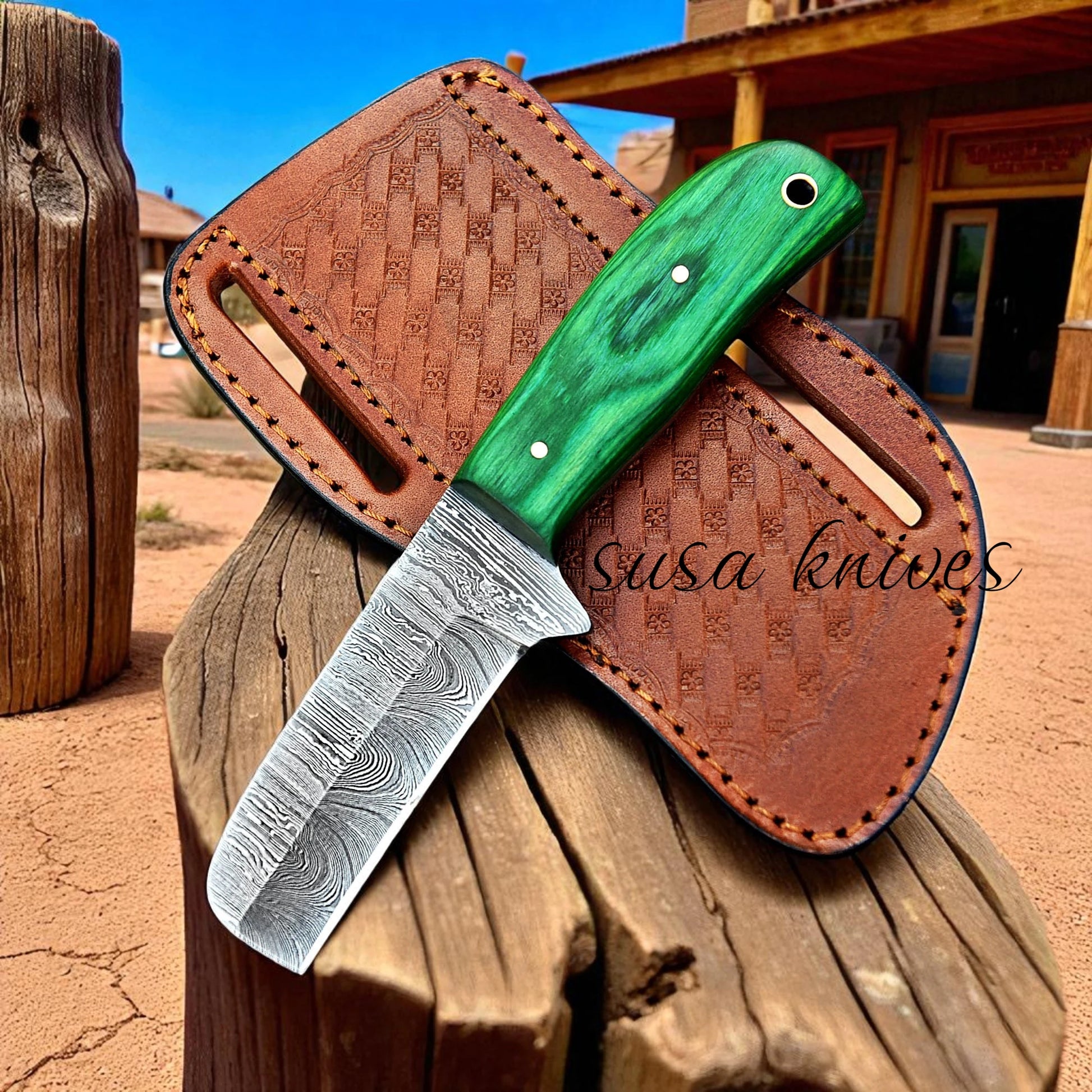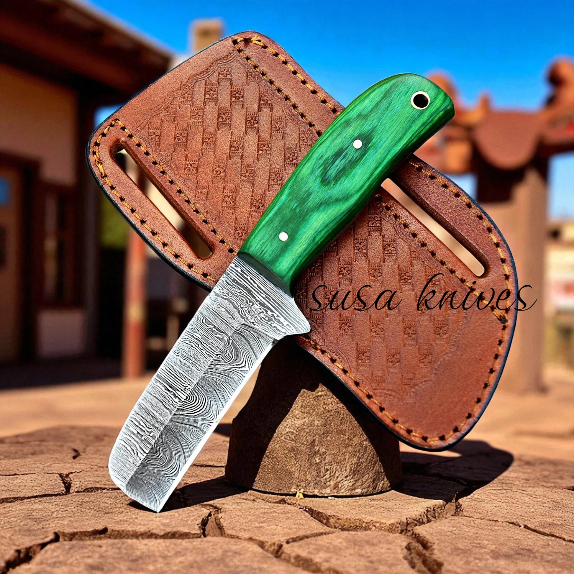 Damascus Bull cutter handmade cowboy knife, pancake leather sheath," "fixed blade, green wood handle